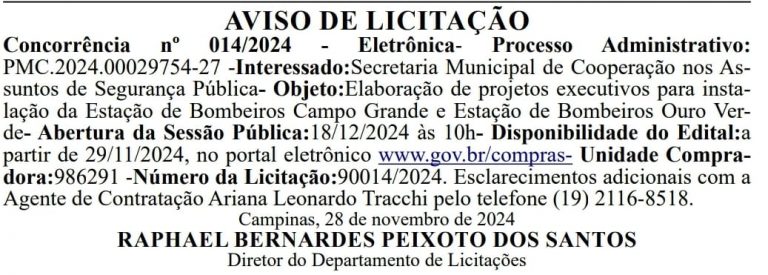 Foram abertos processos licitatórios para os projetos executivos das bases do Corpo de Bombeiros nos distritos do Campo Grande e do Ouro Verde em Campinas. O aviso foi publicado no Diário Oficial da última sexta-feira. O valor global estimado pela Administração é de R$ 221.679,91 para os dois projetos e será vencedora a empresa ou consórcio que apresentar o maior desconto.