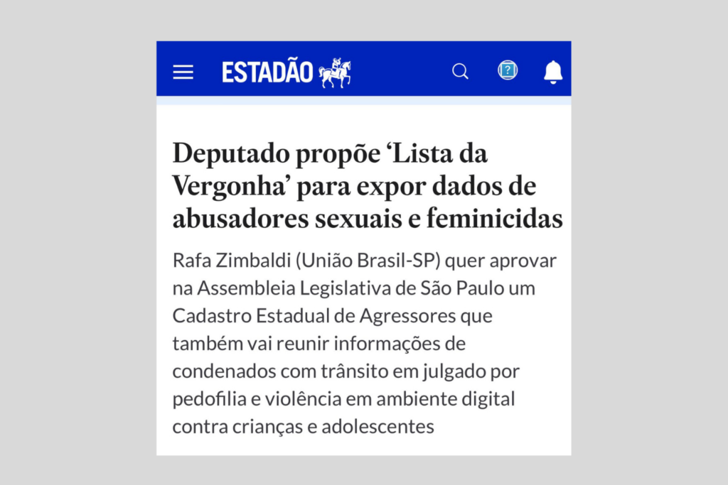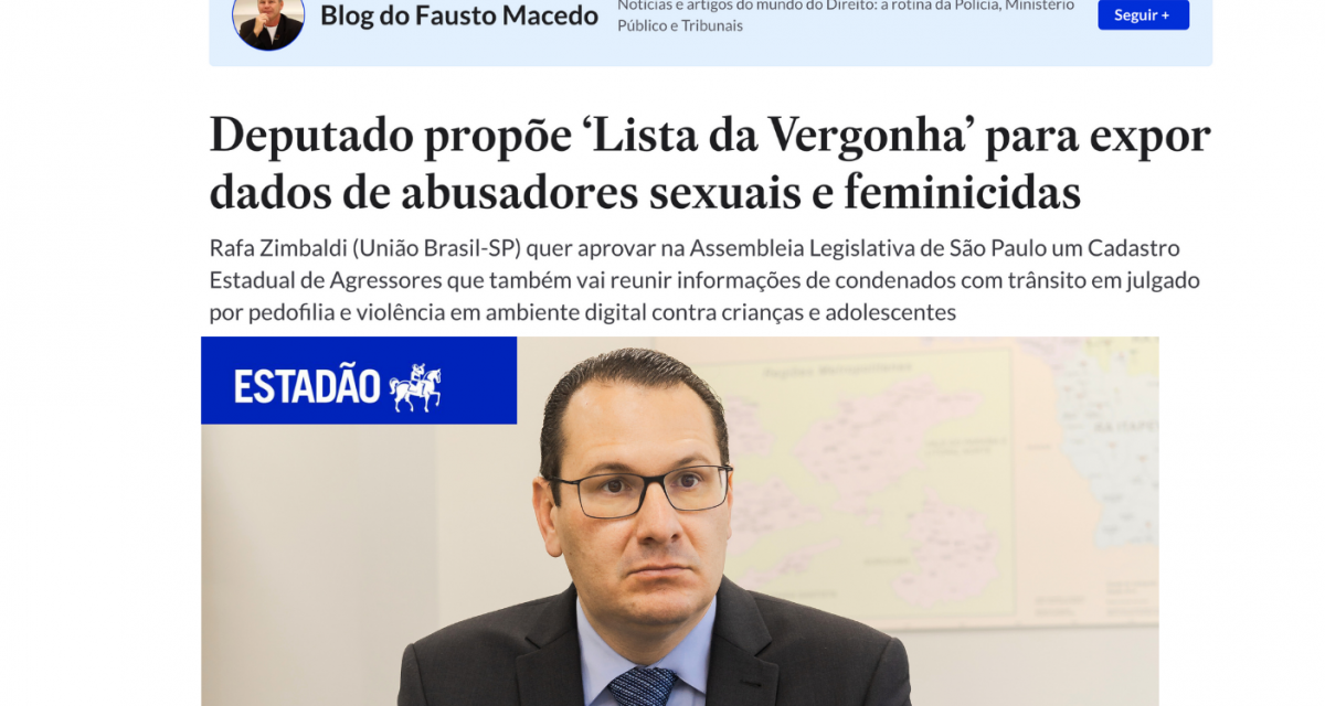 O deputado estadual Rafa Zimbaldi (União Brasil-SP) protocolou na Assembleia Legislativa do Estado de São Paulo (Alesp) o Projeto de Lei 1337/2025, que cria o Cadastro Estadual de Agressores. Denominada como Lista da Vergonha, a proposta cria em todo o Estado de São Paulo um banco de dados sobre condenados com trânsito em julgado por crimes sexuais, pedofilia e violência cometida em ambiente virtual contra crianças e adolescentes.